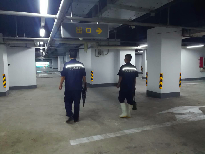 (上图为大龙物业职工检查地下车库防汛重点部位)